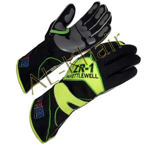 High Quality Racing Gloves with External and Internal seams with silicon printing on palm, Made of 100% Nylon Mix fabric with synthetic leather. New design with great grip on steering, Available color ,Black , Red , Blue , White , Green , Yellow , Orange , Grey …etc.